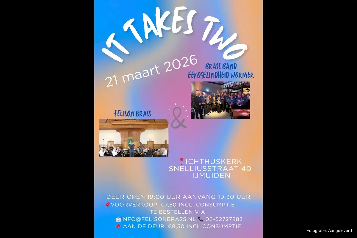 IJMUIDEN - Zaterdagavond 21 maart aanstaande geven Felison Brass en Brassband Eensgezindheid Wormer gezamenlijk het It Takes Two concert. Een avondje vol muzikaal luisterplezier, met een zeer gevarieerd muzikaal aanbod. Zo kunt u onder ander luisteren naar het mooie en ingetogen Prelude ‘49th Parallel van de Engelse componist Ralph Vaughan-Williams. Ook maken we een reis in 80 dagen rond de wereld.