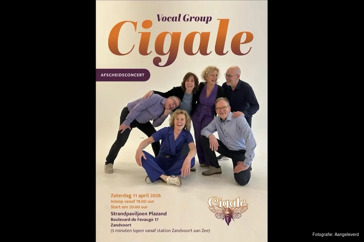 De laatste jaren werd het steeds moeilijker om nieuwe zangers te vinden. Desalniettemin genoten nog vele mensen van het optreden van Cigale bij de laatste Gluren bij de Buren in Haarlem in februari. Rosalie Meulenkamp-Rijs, maar liefst 24 jaar de sopraanrots in de branding bij Cigale: “We zijn een heel hecht gezelschap, maar door de vele wisselingen en het moeilijk vinden van nieuwe zangers, ging figuurlijk de muziek er een beetje uit en ontwikkelden we ons niet meer zo snel.” Nog eenmaal kan iedereen genieten van de muzikale kwaliteiten van Cigale. Het afscheidsconcert is op zaterdag 11 april in strandpaviljoen Plazand, Boulevard de Fauvage 17 in Zandvoort. Inloop vanaf 19 uur, start concert 20 uur. Toegang is gratis. Aanmelden is gewenst door een mail te sturen naar inge.serne@gmail.com